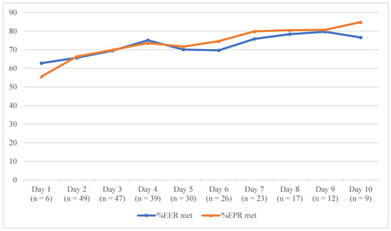 Mean proportion of patients’ estimated nutrition requirements met over time. %EER met: proportion of mean estimated energy requirements met; %EPR met: proportion of mean estimated protein requirements met.