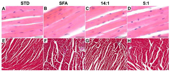 Representative light micrographs of H&E-stained (A–D) and Mallory’s trichrome-stained (E–H) ventricle mid-region heart cross sections after STD (A,E), SFA (B,F), 14:1 (C,G) and 5:1 (D,H) diets. Scale bar—50 µm. STD – standard diet; SFA – high fat diet rich in saturated fatty acids; 14:1 – high fat diet rich in polyunsaturated fatty acids (PUFA) with LA/ALA ratio ~14:1; 5:1 – high fat diet rich in (PUFA) with LA/ALA ratio 5:1.