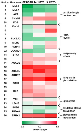 Differentially expressed protein spots between the standard (STD) and high-fat diet groups (SFA, 14:1, 5:1) in mouse cardiac muscle. Proteins were grouped according to their known biological processes. Spot numbers in the table correspond to the numbers in Figure 1 (2-DE proteome map) and Figure 3 (Heat Map).