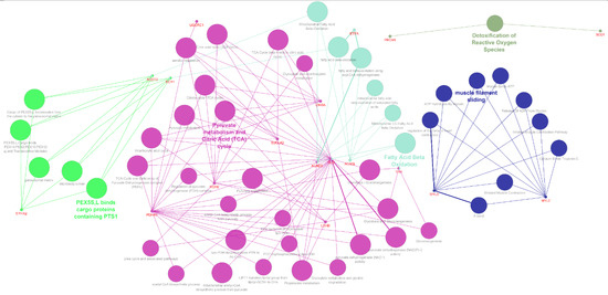 The ClueGO gene network of significantly altered pathways in cardiac muscle after 3 months of high-fat diets ingestion. Each node represents the Gene Ontology (GO) biological process/pathways and colors represent the GO group.