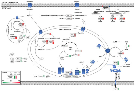 Significantly altered proteins were analysed using the Cystoscape software and the results of ClueGo enrichment are presented in Figure 4. Differentially expressed proteins were assigned to biological processes based on the aforementioned results as well as the data obtained from the STRING software analysis and uniport database. The groups of biological processes included: lipid metabolism and FA β-oxidation (ACADL, ACADS, ACOT2, ECH1, and DLD), glycolysis (TPI1 and LDHB), TCA cycle (IDH3A, SUCLA2, MDH2, and PDHA1), respiratory chain (ETFA and UQCRC1), myocardium contractility (MYL2, MYL3, AK1, CKMM, and FBG), oxidative stress (SOD1 and PRDX6), and PUFA eicosanoid metabolism (EPHX2). Contribution of the identified proteins to cardiomyocyte metabolism and contractile activity for each HFD is displayed in Figure 5.
