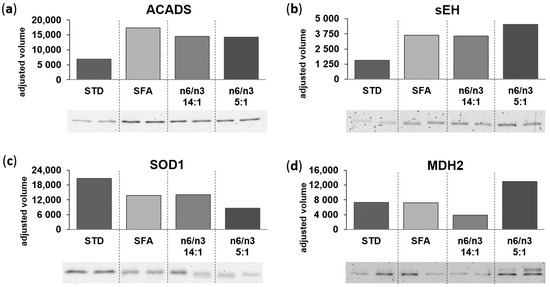 Validation of proteomic data obtained using 2-DE combined with MALDI-ToF MS. Protein expression levels of (a) short-chain specific acyl-CoA dehydrogenase, mitochondrial—ACADS (b) bifunctional epoxide hydrolase 2—sEH (c) superoxide dismutase 1—SOD1 (d) malate dehydrogenase, mitochondrial—MDH2. Western blots represent the murine myocardium from the control (STD) and experimental groups: SFA, 14:1 and 5:1.