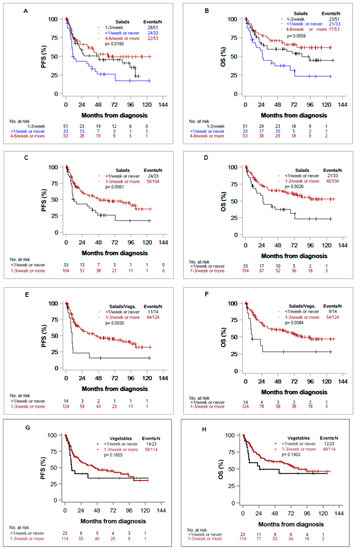 Kaplan–Meier curves for progression-free survival (PFS) and overall survival (OS) in head and neck cancer cases by intake of “salad” (plots A–D), intake of “salad or other vegetables” (plots E,F), and intake of other vegetables (plots G,H). Vertical tick marks indicate censored observations.