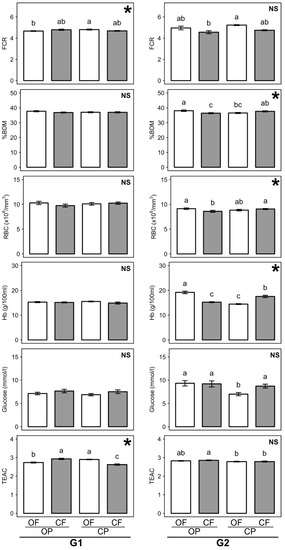It is important to point out that significant differences in basic physiological parameters between rats consuming organic (OFOP) and conventional (CFCP) feed were only detected for TEAC in the G1 and Hb in the G2, which were both higher with organic feed (Figure 2).