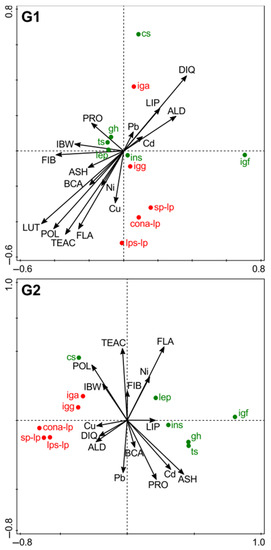 We found significant differences in lipid, fiber, antioxidant (polyphenol, flavonoid, and lutein) and contaminant (aldicarb, diquat, and Cd) profiles between the four different rat feeds (OFOP, CFOP, OFCP, CFCP), but there were no significant differences in protein, ash, β-carotene, N, Cu, Ni, and Pb concentrations (Figure 1, Table S2).
