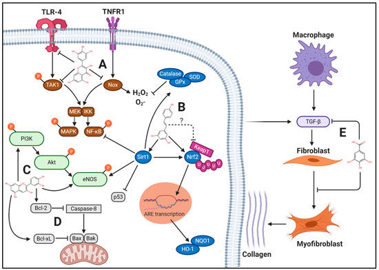 Mechanisms of Berry Polyphenols in CVD. Polyphenols found in berries can attenuate the pathological cellular processes of cardiovascular disease (CVD) in a multi-targeted manner. (A) Berry polyphenols, such as myricetin, reduce inflammation by decreasing toll-like receptor (TLR)-4 activation and phosphorylation of transforming growth factor-β (TGF-β)-activated kinase 1 (TAK1) while also mitigating tumor necrosis factor receptor 1 (TNFR1)-dependent NADPH-oxidase (Nox) activation. Thus, phosphorylation of mitogen-activated protein kinase kinase (MEK) and IκB kinase (IKK) and redox modifications are reduced, preventing downstream activity of mitogen activated protein kinase (MAPK) and nuclear factor kappa-light-chain-enhancer of activated B (NF-κB), respectively. (B) Berry polyphenols, such as resveratrol, reduce oxidative stress by increasing nuclear factor erythroid 2-related factor (Nrf2) protein expression via a number of mechanisms, of which include possible reduction of kelch-like ECH-associated protein 1 (Keap1) binding affinity to Nrf2, reducing Keap1-mediated ubiquitination. Increased Nrf2 nuclear translocation results in increased transcription of heme oxygenase (HO)-1 and NADPH quinone dehydrogenase (NQO1) due to antioxidant responsive element (ARE) transcriptional activity. Additionally, berry polyphenols increase sirtuin 1 (Sirt1) protein expression, which targets a number of proteins, reducing NF-κB and p53 activity while increasing Nrf2 and endothelial nitric oxide synthase (eNOS) activity. Further, Sirt1 increases antioxidant enzymes superoxide dismutase (SOD), glutathione peroxidase (GPx), and catalase, which neutralize superoxide O2− and H2O2. (C) In endothelial cells, berry polyphenols, such as cyanidin, increase phosphoinositide 3-kinase (PI3K) activity, resulting in increased phosphorylation of protein kinase B (Akt) and eNOS, resulting in increased nitric oxide (NO), promoting vasodilation. Additionally, berry polyphenols preserve eNOS protein expression under a number of pathological stimuli, including due to TNFR1 activation. (D) Berry polyphenols reduce apoptosis by increasing B-cell lymphoma 2 (Bcl-2), reducing caspase-8 mediated activation of Bcl-2-associated X protein (Bax) and Bcl-2 homologous antagonist killer (Bak), while Bcl extra-large (Bcl-xL) reduces Bax/Bak oligomerization. (E) Berry polyphenols, such as gallic acid, reduce fibrosis by decreasing TGF-β protein expression and prevent fibroblast differentiation to myofibroblasts, resulting in reduced collagen synthesis. Created in BioRender.com.