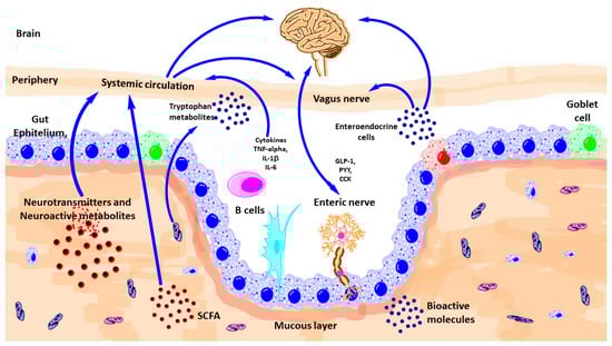 The autonomic nervous system (ANS) comprises the sympathetic and parasympathetic branches. Combined with activity from the enteric nervous system (ENS) and influenced by the CNS, the ANS is responsible for physiological homeostasis, as well as responding to endocrine, motor, autonomic, and behavioral areas. Gut microbiota communicate with ANS bidirectional both antagonistic and synergistically [49,50]. Afferent nerves carry information from visceral organs to CNS and from CNS, important survival messages sent towards peripheral organs. ANS acts as the most immediate responder in health and disease states [51,52,53,54,55,56,57,58]. Local GI autonomic activation can be stimulated by afferent feedback loops from the microbiota and CNS efferent modulation [59]. Microbiota-related metabolites such as tryptophan (and end products, e.g., serotonin-5HT), GABA, catecholamine’s mediate ANS related effects. Sympathetic innervation has post-ganglionic vasoconstrictor effects and also suppressive effects on gut secretions and motility. Intestinal mucus layer is regulated by sympathetic innervation, by modulating mucosal immune system, microbial composition, and function [52,54,60].