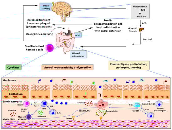 Environmental factors affect immune function. The release of cytokines promotes the activation and recruitment of eosinophils, B cells, and mast cells. In addition to the traditional T-helper 2 pathway, secretion of IL-23 from antigen-presenting cells, such as dendritic cells, B cells, and macrophages, promotes T helper-cell 17 differentiation. Degranulation of these cells disrupt intestinal barrier and enteric nerves. This results in visceral hypersensitivity and dysmotility [19]. α4β7 gut homing T cells are a marker of intestinal inflammation in both functional dyspepsia and irritable bowel syndrome. The site and extend of intestinal immune activation can define the phenotype such as functional heartburn, functional dyspepsia, irritable bowel syndrome, functional constipation, or functional diarrhea [19] (Figure 3).