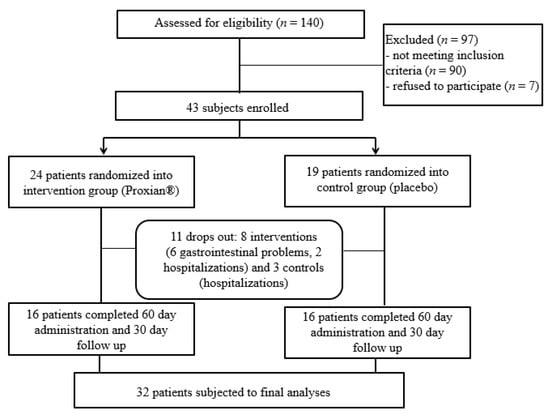 Gastrointestinal problems (diarrhea) and the fear of caregivers that gastrointestinal problems could be due to probiotic supplementation were the reasons for refusing to proceed with administration in six subjects (all from the intervention group); five subjects were lost due to hospitalization for complications of underlying diseases (two from the intervention group and three controls). The final study population was composed of 32 subjects who completed all phases of the trial and were subject to final analyses. This was the minimum sample size required for statistical analyses.