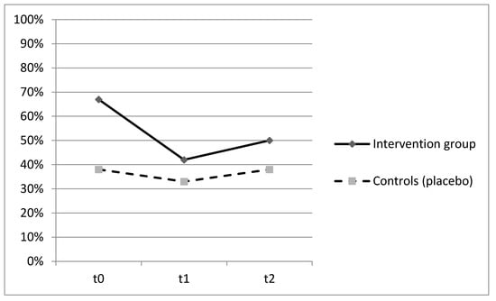The prevalence of subjects with CRP values ≥ 0.8 mL/L decreased in both groups with no statistically significant differences (Figure 3). At baseline, the percentage of subjects with elevated values of CRP was higher in the intervention group (67%) but it decreased following the administration of Proxian® (42%). In the control group, it moved from 38% at baseline to 32% following the administration of placebo. The median value of CRP in the intervention group at baseline was 0.95 mg/L (min 0.2; max 4.9), which decreased to 0.6 mg/L following the administration of Proxian®. While it increased after the last administration, its levels were still below the cut-off value for elevated inflammation (0.7 mg/L; min 0.0; max 10.8). In contrast, the median CRP value of subjects in the placebo group was less than 0.8 mg/L at baseline (min 0.0; max 2.3); although there was some variation during the study period, the same level was seen at the end of follow-up (at t2 median 0.7 mg/L; min 0.2; max 16.8).