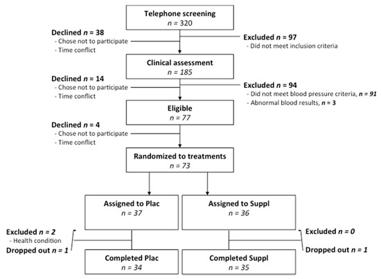 Flow diagram of study participants with prehypertension randomly assigned to a placebo (Plac) or a polyphenol extract and L-citrulline supplement (Suppl).
