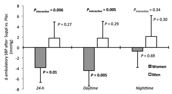 Compared with Plac, Suppl had no impact on mean ambulatory 24-h, daytime and nighttime SBP and DBP (Table 2). However, the exploratory analyses revealed a significant treatment–sex interaction for the change in ambulatory 24-h and daytime SBP (P interaction < 0.01 for both, Figure 2), but not for the change in nighttime SBP (P interaction = 0.34). Specifically, the ambulatory SBP after Suppl was reduced compared with Plac in women (24-h SBP: −3.9 mmHg (95%CI −6.7, −1.1); daytime SBP: −4.4 mmHg (−7.4, −1.5), Figure 2) but not in men (24-h SBP; +1.8 mmHg (−1.3,4.9); daytime SBP: +1.8 mmHg (−1.5, 5.0), Figure 2). No difference in office SBP (p = 0.12) and DBP (p = 0.16) was observed between treatments (Table 2).
