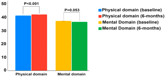 With respect to mental domain, no changes were observed within groups after 6 months of follow-up. In the entire sample, regarding the physical and mental domains, a significant improvement in the physical domain was observed after 6 months of follow-up (41.92(8.52) versus 42.46 (8.43); p < 0.001)), while no change was observed in the summary scores of the mental domain (36.75 (8.43) versus 36.33 (8.03); p = 0.053)) (Figure 1).