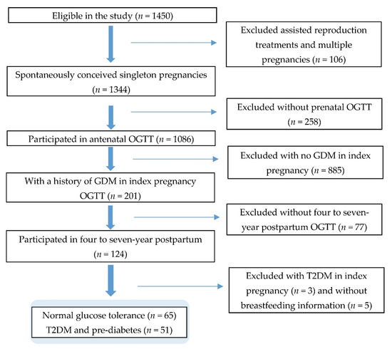 For this study, we included women who completed the oral glucose tolerance test (OGTT) on two occasions—around 26 to 28 weeks’ gestation and four to seven years after the index pregnancy—and provided breastfeeding information. Women were diagnosed with GDM by the WHO 1999 criteria (fasting glucose ≥ 7.0 mmol/L and/or 2 h glucose ≥ 7.8 mmol/L after a 75 g glucose load) [38] in the antenatal OGTT. Women with likely pre-existing T2DM (self-reported or medically diagnosed in the prenatal OGTT with fasting glucose ≥ 7.0 mmol/L or 2 h glucose ≥ 11.1 mmol/L), those who underwent assisted reproduction treatments, and those with multiple pregnancies were excluded (Figure 1).