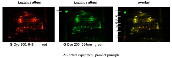 Protein extracts obtained via alkaline extraction of flour from all three lupine species were studied by 1D- and 2D-SDS-PAGE by means of a Refraction-2D labeling kit (NH DyeAGNOSTICS, 1 × 1, 8 nmol PR08, Halle, Germany). The extracts were solved in Milli-Q water, concentrated in a vacuum concentrator and used in the 2D-labeling kit applying 50 µg of each species and filled up to 10 µL of a compatible buffer. The buffer was produced with Tris (30 mM), urea (7 M), thiourea (2 M), 3-[(3-cholamidopropyl)dimethylammonio]-1-propanesulfonate (CHAPS) (4%) (pH 8.5). The working solution consisted of the different dyes (G-Dye 200 (green color), G-Dye 300 (red color), prepared in 4.5 µL G-Dye solvent. The samples (50 µg each plus buffer, 10 µL) plus 1 µL working solution were briefly stirred and centrifuged. Two samples of L. angustifolius extracts and one L. albus extract were dyed green, and two L. luteus extracts and one L. albus extract dyed red. These samples were cooled for 30 min on ice, and the reaction stopped with 1 µL of G-Dye stop solution. These solutions were briefly stirred, put again on ice for 10 min and subsequently investigated or frozen at −80 °C.