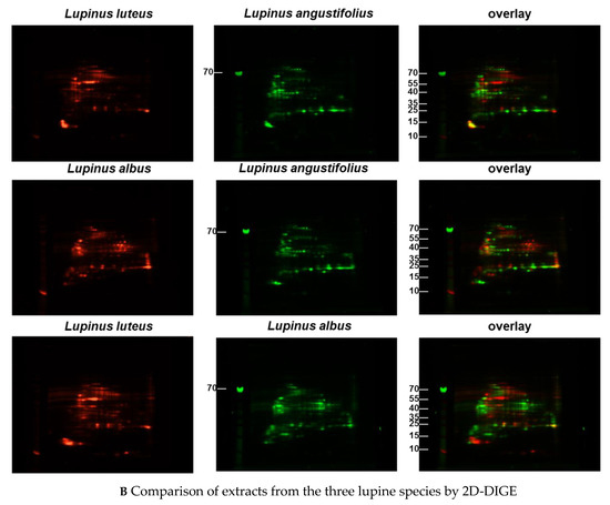 The investigation in the first-dimension gel electrophoresis was performed using the labeled lupine extracts as follows: 5 µL of L. angustifolius extract, dyed green plus 5 µL of L. luteus extract labeled red. The other samples of different lupine species extracts were combined accordingly.