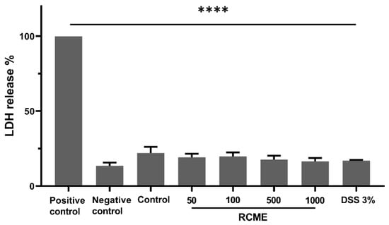 Briefly, the supernatant of post-confluent Caco-2 cells, previously treated with DSS (3%) or RCME (50, 100, 500 and 1000 µg/mL) (see Section 2.1), was mixed with the kit reagent and incubated for 10 min in the dark. The negative control consists of medium only, the control refers to the supernatant from non-treated cells and the positive control refers to the supernatant from cells lysed with 1% Triton X-100. The level of LDH release was measured at an excitation wavelength of 560 nm and an emission wavelength of 590 nm, according to the manufacturer’s instructions.