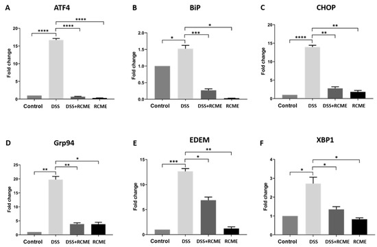 Rosa canina methanol extract (RCME) inhibits dextran sulfate sodium (DSS)-induced ER. The expression of ER-stress markers, (A) activation transcription factor 4, (B) immunoglobulin-binding protein (BiP), (C) C/EBP homologous protein (CHOP), (D) ERAD-enhancing α-mannosidase-like proteins (EDEM), (E) glucose regulated protein 94 (Grp94) and (F) X-box binding protein (XBP1) was significantly reduced in RCME-treated groups. Tukey’s multiple test, * p < 0.05, ** p < 0.01, *** p < 0.001, **** p < 0.0001 versus DSS-treated group, S.E.M., n = 3.
