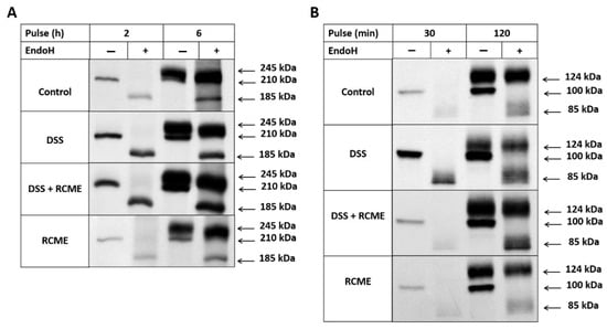 Rosa canina methanol extract (RCME) treatment attenuates dextran sulfate sodium (DSS)-induced delayed trafficking of sucrase-isomaltase (SI) and dipeptidyl peptidase 4 (DPP4). Caco-2 cells were treated or non-treated with DSS, DSS and RCME or RCME. 24 h post-treatment, the cells were continuously labelled with [35S] methionine for (2 and 6 h) or for (30 and 120 min) respectively for SI (A) and DPP4 (B) analysis. The cells were lysed, immunoprecipitated, treated with endo-β-N-acetylglucosaminidase H (endo H) and then subjected to SDS-PAGE followed by fluorography. The figure shown is representative of three different experiments.