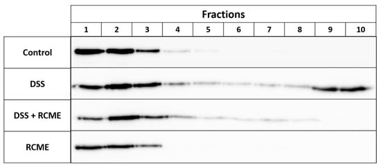 Dextran sulfate sodium (DSS)-induced lipid rafts (LRs) alteration was recovered upon Rosa canina methanol extract (RCME) Figure 2. cells were treated or non-treated with DSS, DSS and RCME or RCME. 24 h post-treatment, the cells were lysed with Triton X-100 and the LRs were isolated on sucrose density gradient. The 10 collected fractions were subjected to SDS-PAGE for flotillin-2 (FLOT2) analysis.