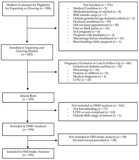 Cohort flow diagram. Breastfeeding participants (194 mother–child pairs) enrolled in two longitudinal studies (www.clinicaltrials.gov, ID# NCT01131117 (Glowing) and ID# NCT02125149 (Expecting)) were included in this study. Of the 194 participants, 39 did not provide food intake records at 2 months and were therefore not included in the intake analyses. HM = human milk, HMO = human milk oligosaccharide, and LTFU = lost to follow up.