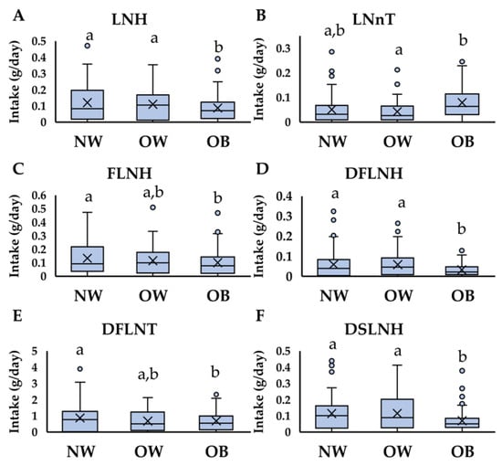 HMO intake at 2 months of age differs between infants born to women with NW, OW, and OB. HMO intakes (mg/day) were estimated at 2 months of age from infants (N = 155) born to women with normal-weight (NW) overweight (OW) or obesity (OB). One-way ANOVAs were performed to identify HMO intakes that differed significantly between groups, where p < 0.05. Differing letters indicate groups with significantly different mean values. (A) Lacto-N-hexaose (LNH), (B) lacto-N-neotetraose (LNnT), (C) fucosyllacto-N-hexaose (FLNH), (D) difucosyllacto-N-hexaose (DFLNH), (E) difucosyllacto-N-tetrose (DFLNT), and (F) disialyllacto-N-hexaose (DSLNH). Box plots indicate the median (central line), the mean (the x in the center of the box), the interquartile range (distance from top of box to bottom of box), the minimum and maximum values (top and bottom of the bar, respectively) and any outliers (dots that fall outside of the min and max).