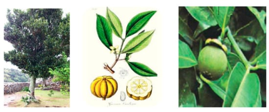 The genus Garcinia, native to Asia and Africa, belongs to the Clusiaceae family and includes more than 300 species, such as Garcinia cambogia (Figure 2), Garcinia mangostana and Garcinia atroviridis [5]. Potential therapeutic effects, such as anti-obesity, anti-ulcerogenic, antioxidant, anti-diabetes, anti-fungal, anti-inflammatory and anti-neoplasic [6], have been attributed to this genus. This has led to multiple investigations by pharmaceutical companies [5]. Some of the bioactive compounds isolated from Garcinia are garcinol, isogarcin, (−)-hydroxycitric acid (HCA), mangostin, and xanthoquimol [6]. It should be noted that out of the species mentioned above, Garcina cambogia is the most used as a nutritional supplement for weight loss or maintenance. The anti-obesity properties have been attributed to HCA, which is present in the rind or epicarp of the fruit and represents 20–30% of the dry weight [7]. Many food supplements containing HCA are currently marketed for weight reduction.