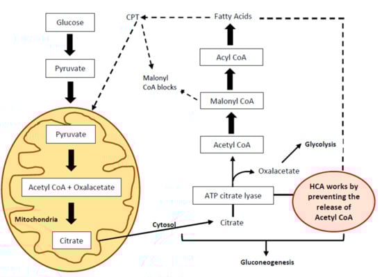 In in vitro studies, HCA has been shown to inhibit fatty acid synthesis [8]. Specifically, in isolated hepatocytes, HCA inhibits the synthesis of fatty acids from glucose, but not from acetate. Therefore, HCA is an inhibitor of lipogenesis only if cytoplasmic acetyl-CoA is produced by ATP-citrate lyase. Nevertheless, fatty acid synthesis is able to continue as long as acetate, another acetyl-CoA precursor, is available. As the synthesis of acetyl-CoA is reduced, that of malonyl-CoA is reduced too, thus decreasing the negative feedback of carnitine acyltransferase. This produces an increase in lipid transport in the mitochondria and inefficient oxidation, that promotes the formation of ketone bodies. These molecules can pass into the bloodstream and reach the brain, where they constitute an energy reserve in the event of fasting [8].