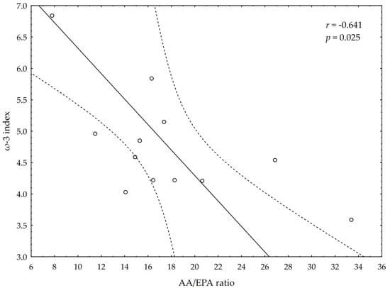 Correlation between omega-3 index (ω-3 index) and AA/EPA ratio.