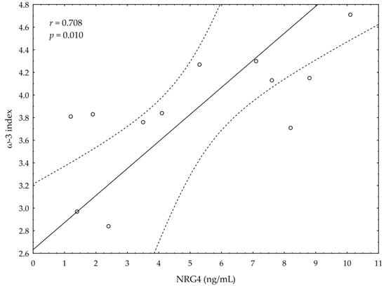Correlations between omega-3 index (ω-3 index) and serum neuregulin 4 (NRG4) levels.