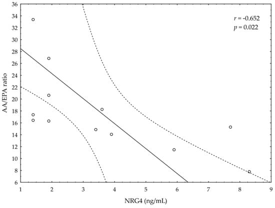 Correlation between AA/EPA ratio and serum neuregulin 4 (NRG4) levels.