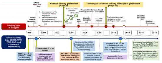 Participants reported three key international directions occurring between 1985 and 1995. These included: (a) Codex Guidelines on Nutrition Labelling, promoting declarations on energy, carbohydrate, protein and fat content (termed as the ‘Big 4’) in 1985 [31]; (b) the World Declaration on Nutrition 1992 urging countries to harmonize with Codex food label requirements [32]; and (c) the establishment of the WTO in 1995, which endorsed Codex guidelines [33]. Case participants noted a lack of significant response in Malaysia to these events during this period, although they did stimulate some policy discussion. Participants commented on the rising trends of overnutrition and NCDs from the 1980s to the 1990s [34,35,36]. Some participants identified government-led prevention actions during this period, such as Healthy Lifestyle Awareness campaigns (1991–2002) that included education on reading food labels [37,38].