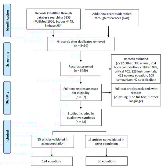 In the initial search, 6353 studies were identified (flowchart in Figure 1). In the final review, 68 studies that developed a new regression equation were included.