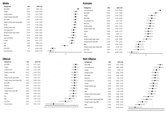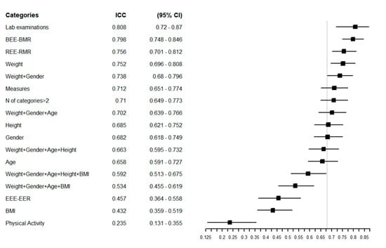 Figure 2 reports the ICC of the overall sample, with a higher ICC indicating greater agreement between the estimated REEs. The equations that showed the greatest agreement in the overall population were those that considered laboratory examinations (ICC = 0.81 (95% CI = 0.72–0.87) and weight (ICC = 0.75 (95% CI = 0.70–0.81) in their structure. The equations with the poorest agreement were those that considered BMI and physical activity, with ICCs of 0.43 (95% CI = 0.36–0.52) and 0.23 (95% CI = 0.13–0.35), respectively (Figure 2).
