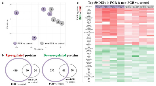 (a) Principal component analysis (PCA) of all quantified proteins demonstrated that hearts of fetal growth-restricted (FGR) neonates had a distinct and more heterogeneous proteomic profile compared to non-FGR ones. (b) Venn diagram showing overlap of differentially expressed proteins compared to controls in FGR and non-FGR groups. (c) Heatmap of top-50 common differentially expressed proteins in both FGR and non-FGR groups vs. control.