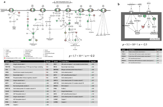 Ingenuity Pathway Analysis of differentially expressed proteins in FGR compared to control showed (a) decreased integrin signaling and (b) decreased apelin cardiac fibroblast signaling pathway.
