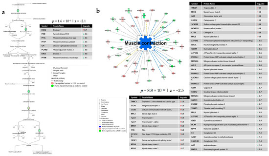 Ingenuity Pathway Analysis (IPA) of differentially expressed proteins (DEPs) in FGR compared to control showed inhibition of the integrin signaling (p = 1.7 × 10−8; z = −2.2) (Figure 2a) and apelin cardiac fibroblast signaling canonical pathways (p = 5.1 × 10−4; z = −2.5) (Figure 2b). Furthermore, IPA predicted a significant decrease in glycolysis (p = 1.6 × 10−5; z = −2.1) (Figure 3a) and muscle contraction (p = 8.8 × 10−12; z = −2.5) (Figure 3b) in the hearts of FGR neonates vs. control. Finally, a protein network related to carbohydrate metabolism, cell death and survival and embryonic development was over-represented in the DEPs of FGR vs. control pups (Score = 47, n = 33 proteins) (Figure 4).