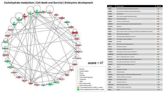 Ingenuity Pathway Analysis of differentially expressed proteins in FGR compared to control showed over-representation of a protein network related to carbohydrate metabolism, cell death and survival, and embryonic development.