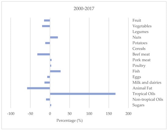 In the time period 2000–2017, the amount available for consumption has remained stable (i.e., <5% observed change) for cereals, legumes, pork meat, poultry, eggs, and sugars. A relevant decline is observed for animal fat and beef meat (−58% and −32%, respectively), with negative trends starting from the years 2009–2011. Fruit, potatoes, and vegetable supplies have also progressively declined in comparison with the years 2000–2003, albeit to a lesser extent (i.e., −20%, −15%, and 13%, respectively); these trends began in the first decade of the century for potatoes and vegetables, and more recently, in the years 2012–2014, for fruit. During the study period, the consumption of milk (including dairy foods) and non-tropical oils have also declined substantially (−14% and −11%, respectively) (Table 1, Figure 1).