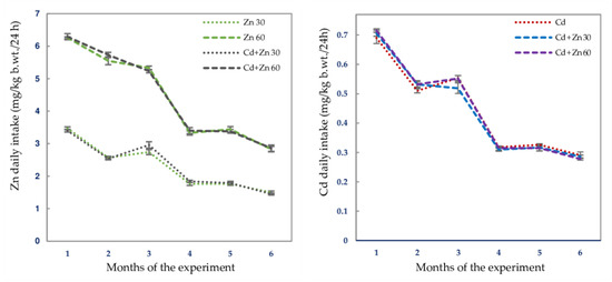 | Experimental Group | Intake of Zn Mean/Range (mg/kg b.w./24 h) | Intake of Cd Mean/Range (mg/kg b.w./24 h) |