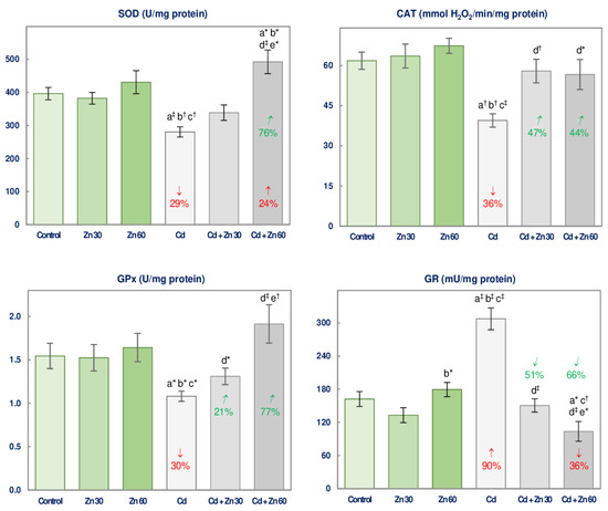 3.1. The Impact of Cd and/or Zn on the Enzymatic Antioxidative Status of the Brain