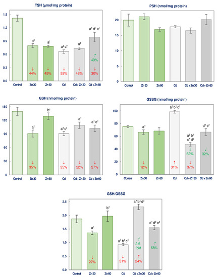 3.2. The Impact of Cd and/or Zn on the Non-Enzymatic Antioxidative Status of the Brain