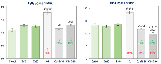 - Kostecka-Sochoń, P.; Onopiuk, B.; Dąbrowska, E. Protective effect of increased zinc supply against oxidative damage of sublingual gland in chronic exposure to cadmium: Experimental study on rats. Oxid. Med. Cell. Longev. 2018, 2018, 3732842. [Google Scholar] [CrossRef] [PubMed]