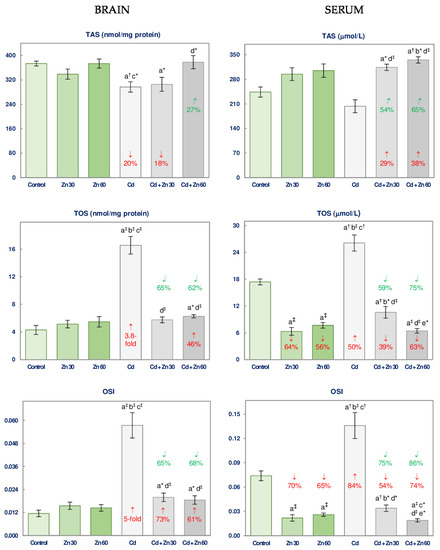 3.4. The Impact of Cd and/or Zn on TAS and TOS and the Severity of Oxidative Stress in the Brain and Serum