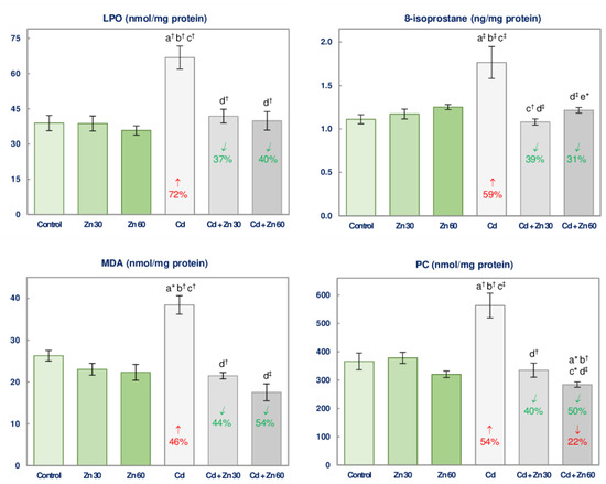 3.5. The Impact of Cd and/or Zn on the Oxidative Injury of Lipids and Proteins in the Brain