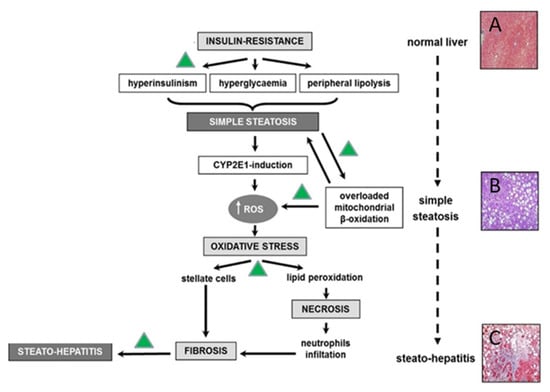 Pathogenic mechanisms involved in the progression of NAFLD and possible sites of polyphenols action (green triangles). (CYP2E1: Cytochrome P450 2E1, ROS: reactive oxygen species). (A)Normal liver parenchyma is composed of small lobules of hexagonal shape with portal tracts at the apices; (B) hepatocytes contain one or more large fat droplets that displace the nucleus to an eccentric position; and(C) ballooning degeneration of hepatocytes, scattered inflammation, and apoptotic bodies.