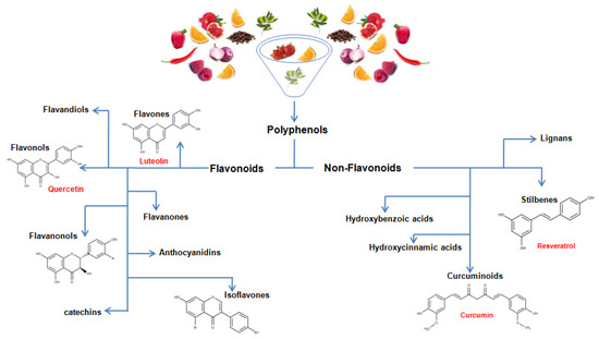 Polyphenols represent an immense family of organic compounds widely present in natural products. The term polyphenol derives from the presence in the chemical structures of phenolic groups that are established in more or less complex structures. Due to their great variety, polyphenols are classified into flavonoids and non-flavonoids (Figure 2). Among the flavonoids, which represent the largest family of polyphenols, we find flavones, flavandiols, flavonols, flavanonols, catechins, flavanones, anthocyanidins, and isoflavones. Among the non-flavonoids, we find stilbenes, lignans, and phenolic acids, which are divided into hydroxybenzoic acids and hydroxycinnamic acids [26]. Flavonoids are characterized by a basic chemical structure with 15 carbon atoms C6-C3-C6 in which we find two aromatic rings indicated with A and B joined to a pyran indicated byC, as shown in Figure 3. The various classes of flavonoids differ from each other for the degree of oxidation of the C ring and the substitutions of the A, B, and C rings [26]. In this regard, flavones, flavonols, flavanols, and flavanones are characterized by the presence of a carbonyl function on the C4 and by the presence of the aromatic ring B bound to C2, these compounds differ in the substituents present on the rings. Among these compounds, we find quercetin, one of the most famous polyphenols belonging to the group of flavonolsthat are widely spread, for example in red onion, purple potatoes, and peppers. On the contrary, the group of catechins is characterized by the absence of the carbonyl function in C4 and the double bond in C2-C3. Furthermore, the catechins have a hydroxyl group in position C3, which together with the orientation of the benzene ring in C2 are responsible for the configuration of the catechins themselves. The anthocyanidins instead represent cationic molecules characterized by the absence of the carbonyl function in C4 and by two double bonds in C1-C2 and C3-C4. Furthermore, unlike the other flavonoid compounds, isoflavones do not have the typical structure of 2-phenyl-benzopyrone, instead they are characterized by a 3-phenylchromone structure. While a basic chemical structure with common characteristics is recognized in the flavonoids, the group of non-flavonoids represents, on the one hand, a much more heterogeneous cluster. Among the most interesting compounds belonging to non-flavonoids we find resveratrol, belonging to the group of stilbenes, a compound typically present in red wine, characterized by the presence of two aromatic rings spaced by an ethylene chain. Furthermore, in the context of non-flavonoids, one of the noteworthy compounds is certainly curcumin, a curcuminoid characterized by two aromatic rings spaced by an heptandiene chain characterized by two carbonyl functions.