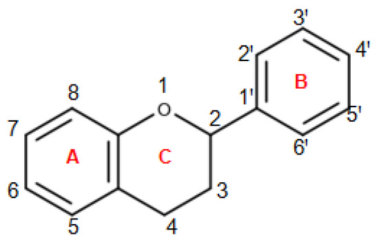 Representation of the chemical structure of 2-Phenylchroman, shows the basicnucleus of flavonoids, indicating the chroman (A,C) and the aromatic ring in position 2 (B).