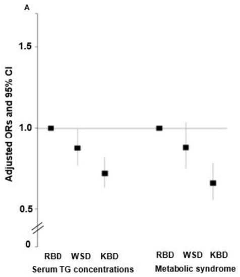 Among the metabolic parameters, metabolic syndrome incidence had an inverse association by 0.658 times (95% CI = 0.556–0.78) with KBD compared to RBD, and serum triglyceride concentrations were inversely associated with WSD and KBD by 0.874 and 0.718 times, respectively, compared to RBD (Figure 1A). Interestingly, serum CRP concentrations and WBC counts, inflammatory indices, had an inverse association with KBD by 0.776 and 0.705 times, respectively, compared to RBD (Figure 1B). However, they were not significant associations of serum CRP concentrations and WBC counts with WSD.