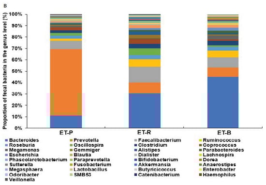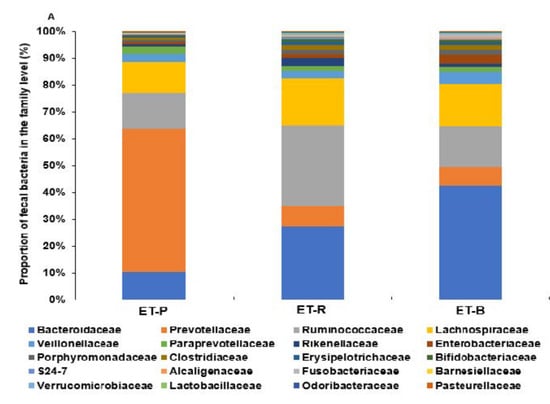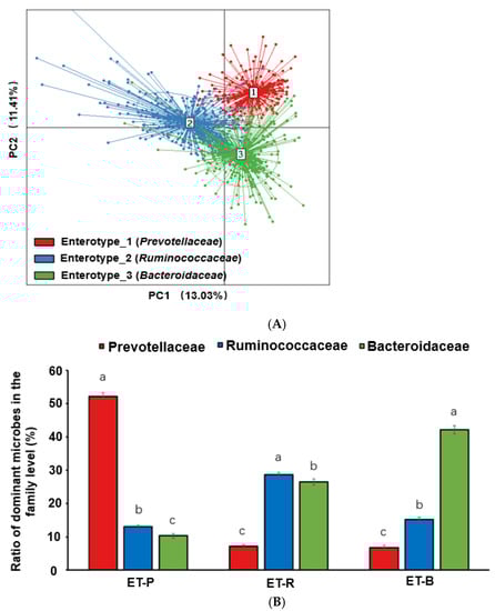 Fecal bacteria were classified into enterotype 1, enterotype 2, and enterotype 3 in the family level (Figure 3A) and genus levels (Figure 3B). At the family level, Prevotellaceae in the ET-P was significantly higher than that of other bacteria. The dominant bacteria of ET-R and ET-B were Ruminococcaceae and Bacteroidaceae, respectively (Figure 3A). However, ET-R also had a higher proportion of Bacteroidaceae than ET-P (p < 0.05; Figure 3B). At the genus level, ET-P and ET-B predominantly contained Prevotella (57.4%) and Bacteroides (45.3%), whereas ET-R rather than the presence of dominant bacteria (Figure 3B).
